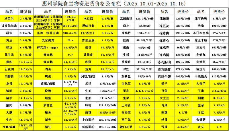 惠州学院食堂物资进货价格公布栏(2025.10.01-2025.10.15)