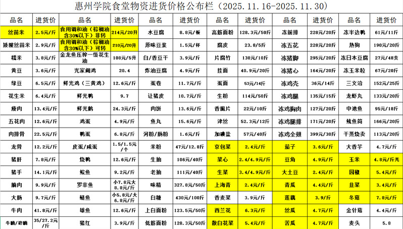 惠州学院食堂物资进货价格公布栏(2025.11.16-2025.11.30)