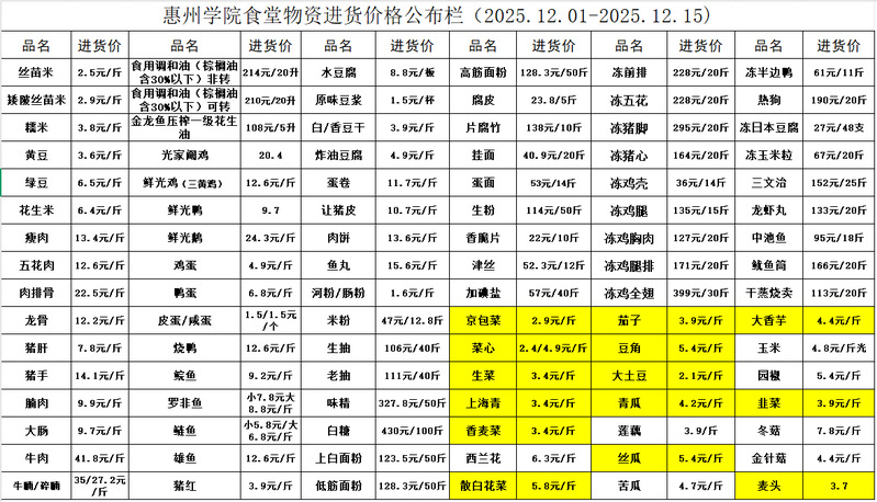 惠州学院食堂物资进货价格公布栏(2025.12.01-2025.12.15)