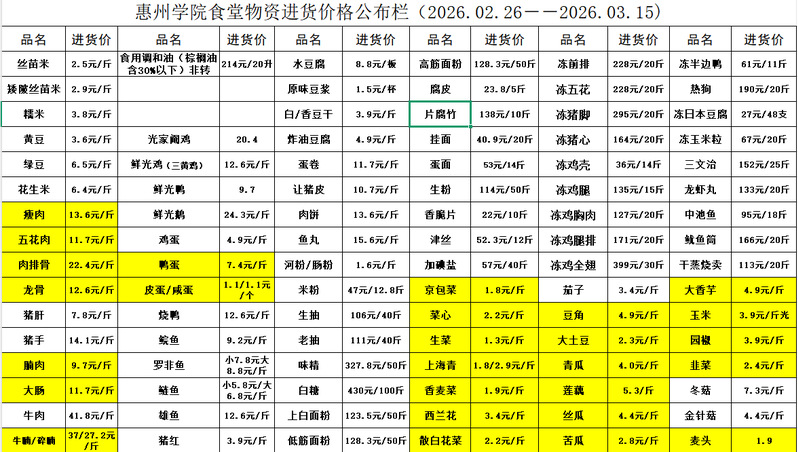 惠州学院食堂物资进货价格公布栏(2026.02.26-2026.03.15)