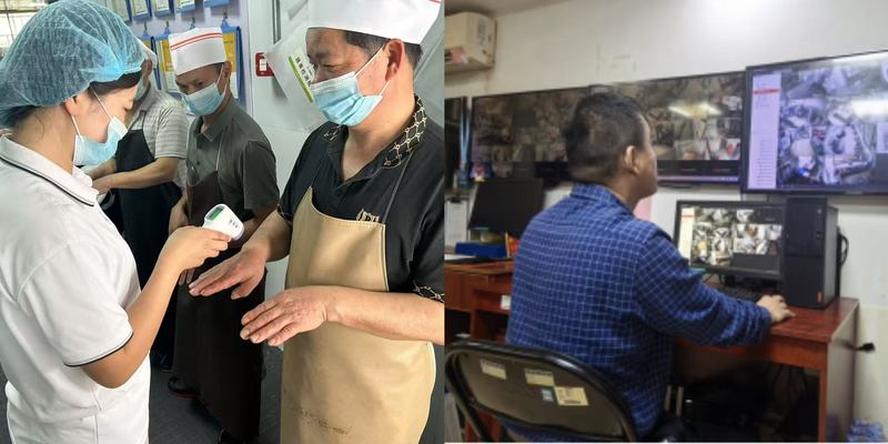 食堂员工体温检测、“互联网+明厨亮灶”系统检查现场