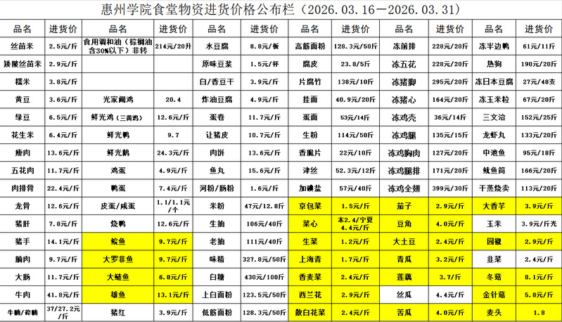 惠州学院食堂物资进货价格公布栏(2026.03.16-2026.03.31)