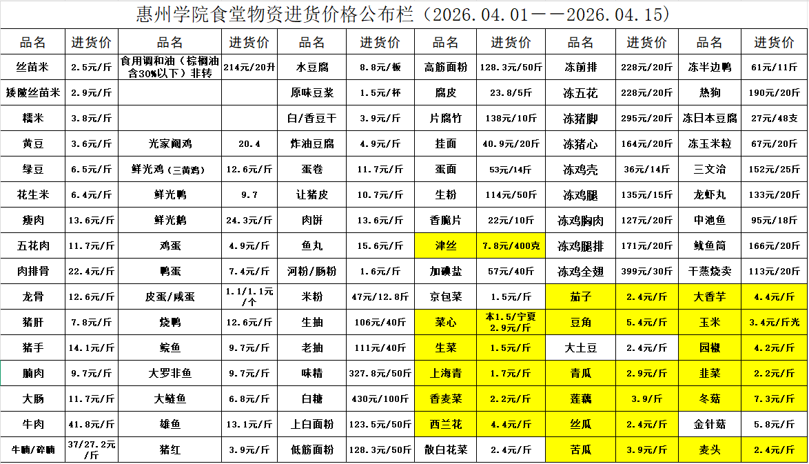 惠州学院食堂物资进货价格公布栏(2026.04.01-2026.04.15)
