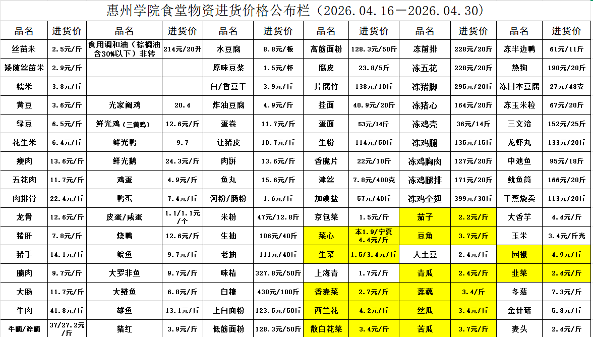惠州学院食堂物资进货价格公布栏(2026.04.16-2026.04.30)